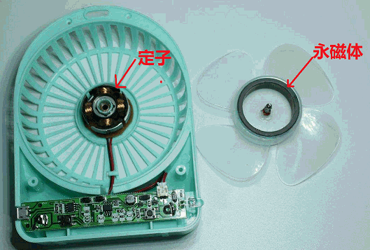 2.單相直流無(wú)刷電機(jī)原理是:同極相斥,異極相吸。這兩個(gè)磁極是通過(guò)電磁鐵(定子)和永磁鐵(轉(zhuǎn)子)來(lái)形成,所謂電磁鐵就是通電就會(huì)有磁場(chǎng)產(chǎn)生,在單相電機(jī)里面,也就是定子(不動(dòng)的部分),如下圖所示,是漆包線繞在硅鋼片上。而永磁鐵則貼在扇葉(轉(zhuǎn)子)上。