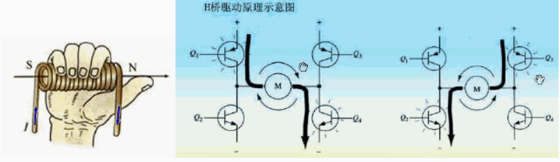3.有了前面的感官認(rèn)知,方便后續(xù)講解,希望大家不要嫌棄羅嗦,畢竟每個(gè)人的情況不一樣,我們要盡可能多的照顧更多的人,其實(shí)單相電機(jī)控制--就是利用H橋(4個(gè)MOSFET)來(lái)控制電磁鐵(定子)磁場(chǎng)。根據(jù)右手螺旋定則可知,不同的電流方向,會(huì)得到不同的磁場(chǎng)極。利用H橋來(lái)實(shí)現(xiàn)電流換相,最終得到不同的磁極,從而達(dá)到同極相斥,異極相吸的目的,如下圖所示:當(dāng)Q1Q4導(dǎo)通時(shí),電流從左向右流動(dòng);當(dāng)Q2Q3導(dǎo)通時(shí),電流從右向左流動(dòng)。