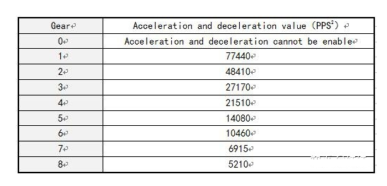 如下圖圖示,42mm兩相混合式步進電機系列系統(tǒng)總線中小型步進電機控制器的加加減速機時間分八個級別,各自相匹配1-8的加降速指數,標值越倍加減速時間越長