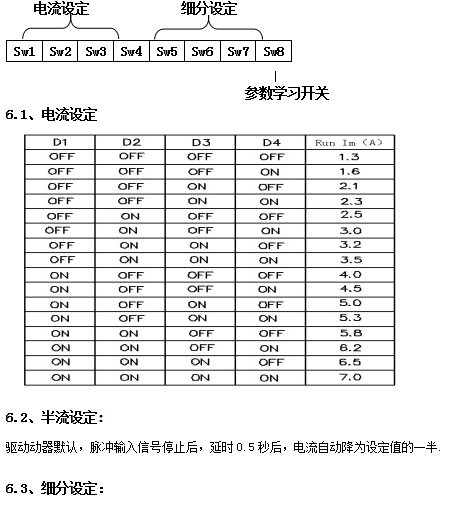 驅(qū)動(dòng)器采用八位撥碼開(kāi)關(guān)設(shè)定細(xì)分精度、動(dòng)態(tài)電流、靜止半流以及實(shí)現(xiàn)電機(jī)參數(shù)學(xué)習(xí)與PID整定。八位撥碼開(kāi)關(guān)詳細(xì)描述如下: