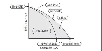步進電機的轉速取決于驅動脈沖的頻率,因此速度-轉矩特性又稱轉矩-頻率特性。這一特性相當于普通直流電機的轉速-轉矩特性。在普通直流電機轉速-轉矩特性圖中,橫軸為轉矩,縱軸為轉速。但在步進電機中,一般橫軸為脈沖頻率,縱軸為扭矩,如圖3所示。我們可以看到一個空載啟動區,對電機施加這個范圍內的頻率和扭矩,電機可以正常啟動并同步旋轉。另外,在空載啟動區運行的馬達繼續增加扭矩和輸入頻率時,馬達可以看到不會失步的旋轉范圍。其上限頻率稱為最大響應頻率。該特性隨著驅動電路和負荷的旋轉慣性發生了很大變化。