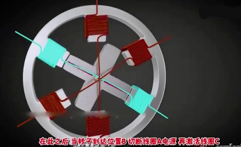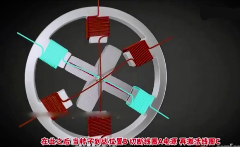 A相線圈通電時,上下兩個線圈在定子上形成N極,吸住轉子,此時轉子不動,若此時A相斷電,B相上電,那么,轉子將運動。