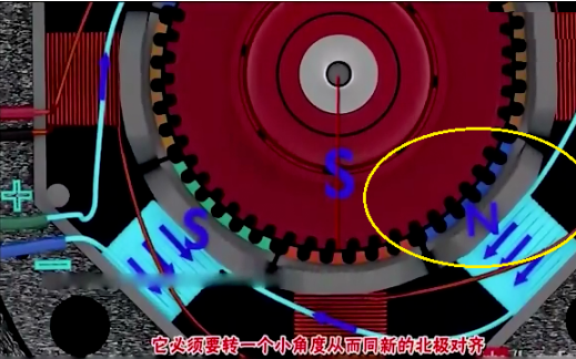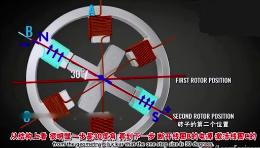 那么此刻,轉子的轉動角度就是15°,此時斷開A線圈的通電,保留B線圈通電,那么轉子就會轉去與B線圈吸合,再轉15°。