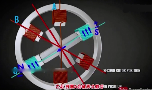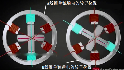 若A線圈通電的同時,給B線圈通電,那么,轉子會處在A和B線圈通電時位置的中間位置。
