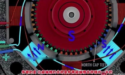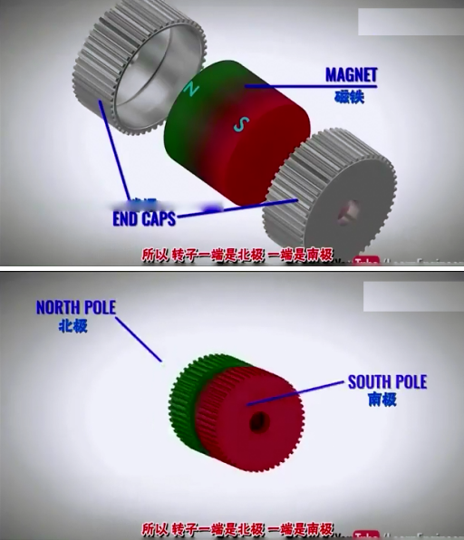 此電機的轉子由一個磁芯和兩個帽箍組成,具有南極和北極之分。