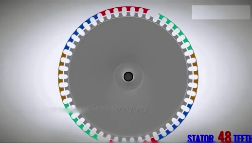 綠色組齒部移動到與轉子齒部半對齊的位置,黃色組的齒部移動到完全與轉子齒部完全錯位,藍色組齒部移動到與轉子齒部半對齊的位置,紅色組齒部原位不動。簡單的說,就是一組完全對齊,一組完全錯位,兩組半對齊。