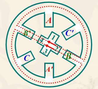 所以轉(zhuǎn)子轉(zhuǎn)到兩磁拉力平衡的位置上。相對AA' 通電,轉(zhuǎn)子轉(zhuǎn)了15°。