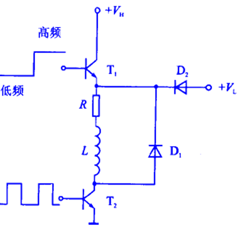 開始時T1T2同時導通, VH供電,i迅速上升VH很快關斷,VL繼續供電。