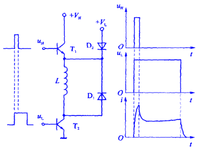 高頻:給T1高電平®導通。D2反向截止,切斷低電壓電源VL,電動機繞組由高電壓VH供電、控制脈沖通過T2,使繞組得到高壓脈沖。