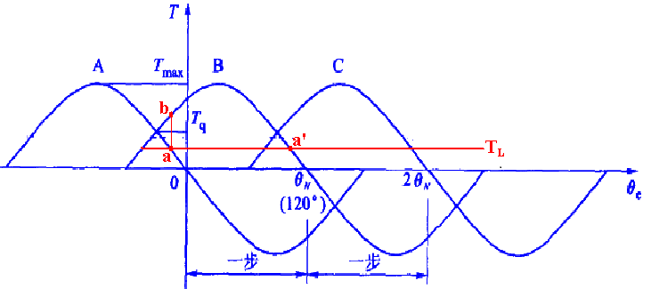 步進(jìn)運(yùn)行所能提供的連續(xù)的最大驅(qū)動(dòng)轉(zhuǎn)矩為A、B兩條曲線的交點(diǎn)縱坐標(biāo)Tq。只有當(dāng)負(fù)載轉(zhuǎn)短Tl